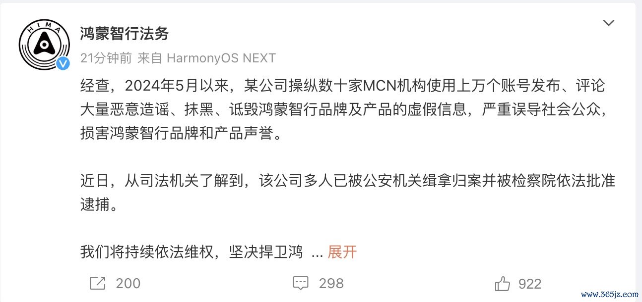 鸿蒙智行法务:某公司大量恶意造谣、抹黑、诋毁鸿蒙智行品牌,该公司多人被缉拿归案鸿蒙智行法务:某公司大量恶意造谣、抹黑、诋毁鸿蒙智行品牌,该公司多人被缉拿归案